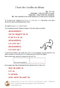 En nous basant sur les comptines, d’abord racontées puis montrées par écrit, nous vous proposons d’inviter votre enfant à visualiser les lettres de l’alfonic qui correspondent aux sons entendus (un exercice proposé par Liliane Witkowski, enseignante). Cette approche le rendra progressivement sensible aux sons du français et lui fera comprendre intuitivement le principe « une lettre vaut un son ». Lorsque ce principe lui sera devenu évident, il démontrera sans doute une vive envie de communiquer par écrit.