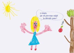 Image : l’illustration est un dessin de Sylviane, 5 ans. C’est elle qui a rédigé le texte du phylactère, mais celui-ci a été retapé à l’ordinateur car le dessin était déjà scanné lorsque l’auteure a voulu y ajouter du texte pour les besoins d’une publication en livret (atelier d’expression).