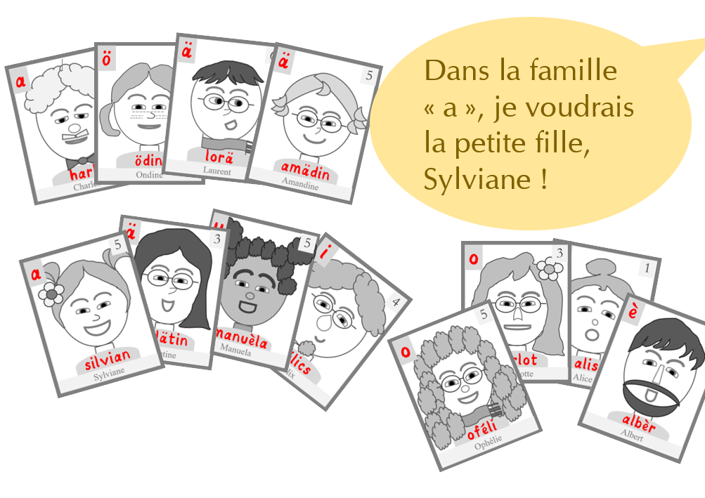 Aujourd’hui, pour encourager les enfants à lire en alfonic tout en s’amusant, nous proposons un jeu des sept familles. Chaque personnage est représenté par une carte qui montre son portrait, son prénom, son numéro dans la famille, et la famille du phonème auquel il appartient. Pour les adultes qui auraient du mal à utiliser l’alfonic, chaque carte comporte également le prénom en orthographe.