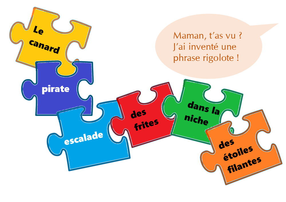 C’est un jeu qu’on peut faire en dessin, en mots ou en phrases complètes. L’activité d’aujourd’hui propose des mots ou groupes de mots, qu’il faut rassembler comme les pièces d’un puzzle. Grammaticalement, les joueurs disposent de sujets, d’adjectifs, de verbes, d’objets directs, d’objets indirects ou compléments, et de compléments du nom.
