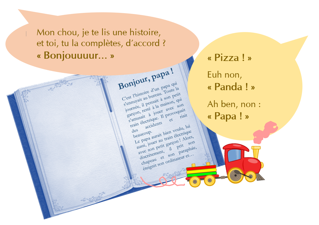 Lire n’est pas nécessairement une activité solitaire. Qui a dit qu’on ne pouvait pas lire à deux ? Dans un dialogue, c’est facile de se répartir les rôles. Mais on peut encore faire plus simple pour des enfants qui n’ont pas encore l’habitude de lire de longues phrases. Par exemple, en leur lisant un texte dont seuls certains mots requièrent leur attention.