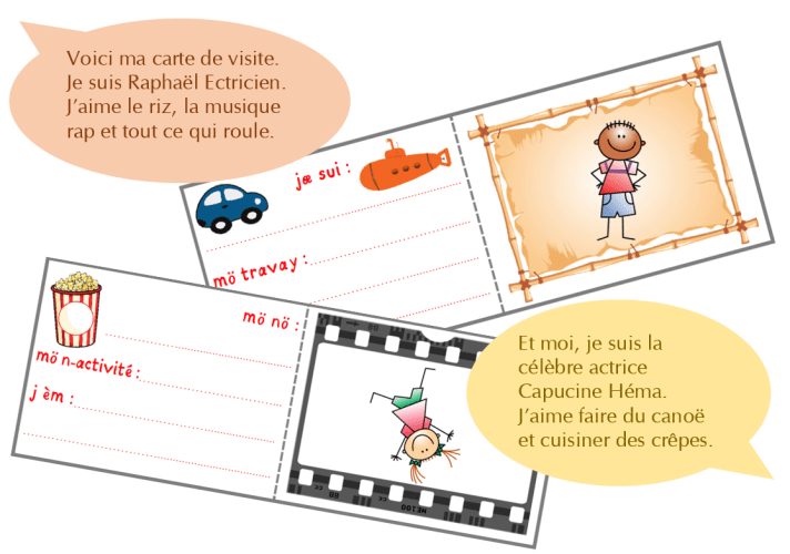 Pour encourager les enfants à s’exprimer, demandons-leur de se présenter en quelques mots. « Comment t’appelles-tu ? Qu’aimes-tu ? Quel métier veux-tu faire plus tard ? » Par écrit, cette présentation peut prendre la forme de petites cartes de visite qu’on demandera à chaque élève de remplir en alfonic. Puis chacun est invité à venir se présenter devant toute la classe et faire passer sa carte de visite auprès de ses camarades.