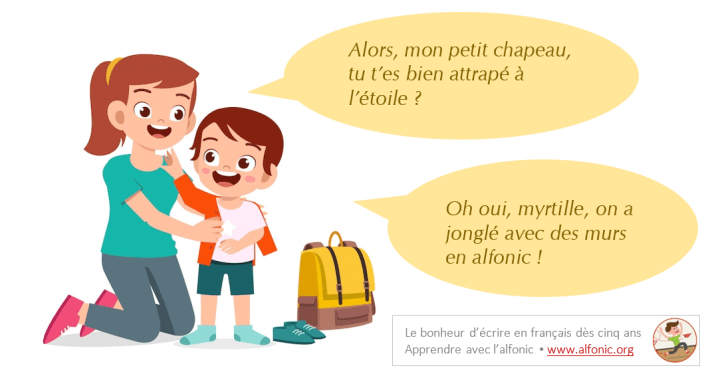 Dans le cadre de l’alfonic, on peut varier l’activité de plusieurs manières : soit demander aux enfants de choisir parmi les choix multiples que nous proposons, soit les inviter à trouver eux-mêmes de nouveaux mots. Ces nouveaux mots peuvent être complètement libres, ou au contraire suivre une consigne : un mot qui termine par la même rime, ou un mot qui débute par le même son.