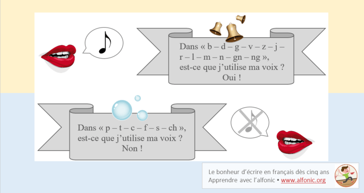 L’activité d’aujourd’hui vise à faire prendre conscience de la présence de la voix dans les consonnes du français. C’est un exercice qui se révèle non seulement utile pour les jeunes francophones mais, de plus, intéressant pour des enfants dont le français n’est pas la langue maternelle.