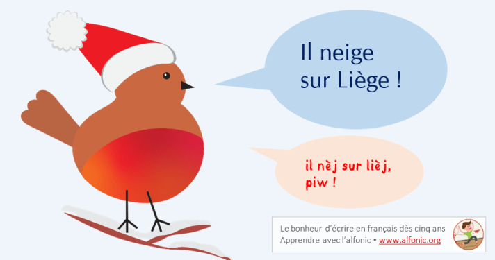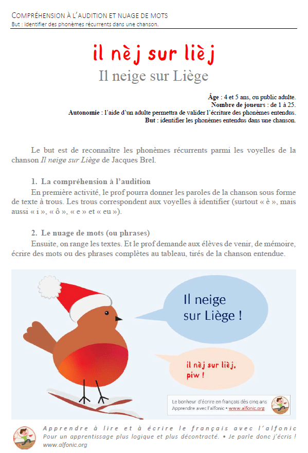 Aujourd’hui, nous proposons donc l’écoute active de la belle chanson de Jacques Brel, Il neige sur Liège. Les applications concrètes ne sont pas compliquées : on peut d’abord inviter les enfants à compléter les paroles du texte écrit (en alfonic) avec les bons phonèmes. Puis leur proposer de venir écrire au tableau tous les mots, toutes les phrases dont ils se souviennent (selon le principe du « nuage de mots ») : les élèves sont alors encouragés à écrire précisément tous les phonèmes qu’ils ont repérés dans les mots.