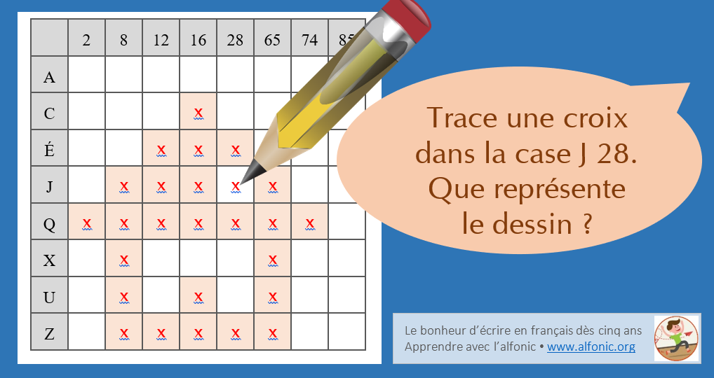 Pour permettre aux étudiants de s’entraîner, nous proposons également un petit jeu de « dessin au point de croix ». Le prof aura préalablement dessiné au tableau un cadrillage en damier, dont chaque case correspondra à une lettre et à un numéro (les lettres ne sont pas nécessairement les premières de l’alphabet, qui sont trop faciles ; et les numéros ne vont pas nécessairement de zéro à neuf, puisque l’intérêt est de faire réviser les nombres difficiles). Un étudiant va au tableau ; un autre étudiant pioche un des six papiers de « dessin » et dicte à son camarade un endroit à marquer d’une croix, puis il passe le papier à son voisin de classe. Chacun à son tour, les étudiants assis « dictent » un endroit à marquer en respectant le dessin pioché. Une fois que toutes les cases à marquer sont noircies au tableau, on demande à l’étudiant qui « dessine » ce que représente le résultat.