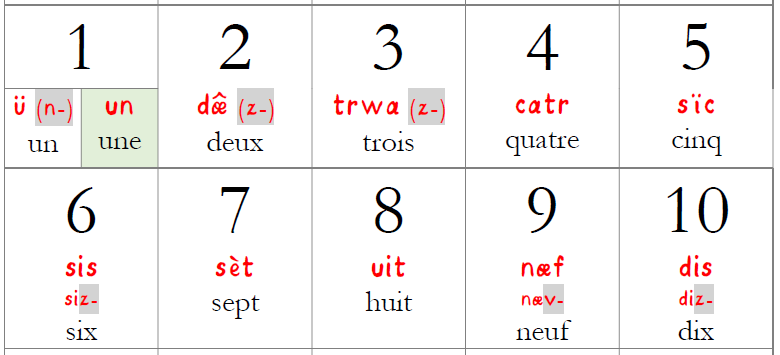 Voici donc un document qui exprime, en alfonic et en orthographe, les chiffres de zéro à neuf, les dizaines, les centaines et les milliers. L’alfonic permet aussi de préciser les liaisons et d’autres particularités de prononciation. Par exemple, on dit :