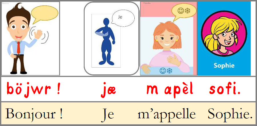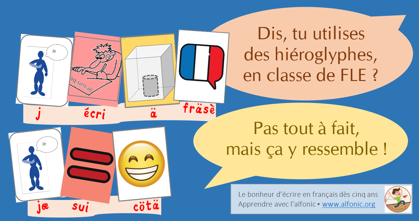 Une fois les premières phrases du français bien intégrées grâce aux images, nous passons à l’écriture alfonic. Dès le départ, l’orthographe est présente en « sous-titres ». Puis, peu à peu, je remplace l’alfonic par l’orthographe, qui finira par devenir la seule graphie utilisée en classe.