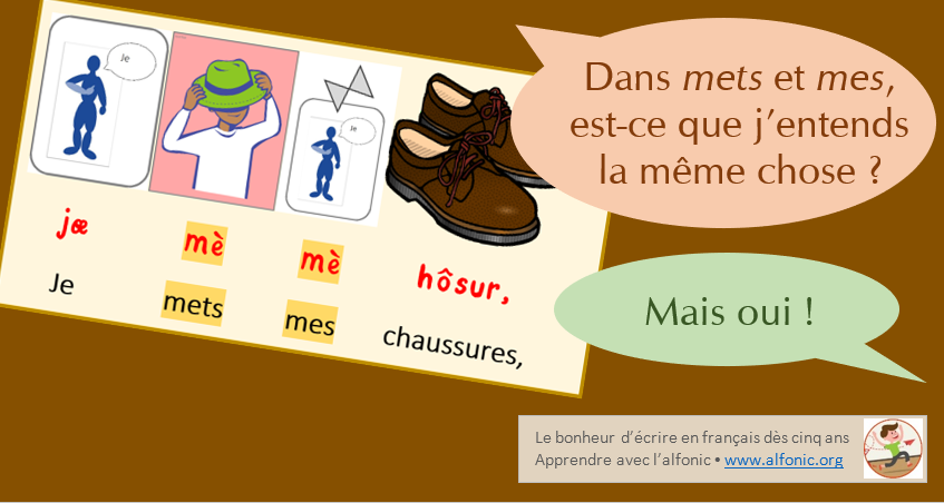 Depuis plusieurs mois, j’utilisais l’alfonic et l’orthographe en parallèle, considérant l’un comme le sous-titre de l’autre ou vice-versa. En même temps, pour « orienter » les oreilles de mes étudiants vers une identification sans cesse plus précise des phonèmes du français, je leur fais remarquer oralement, le plus souvent possible, les moments où les mots sonnent de la même manière – ou non –, malgré nos raffinements orthographiques trompeurs. Par exemple,