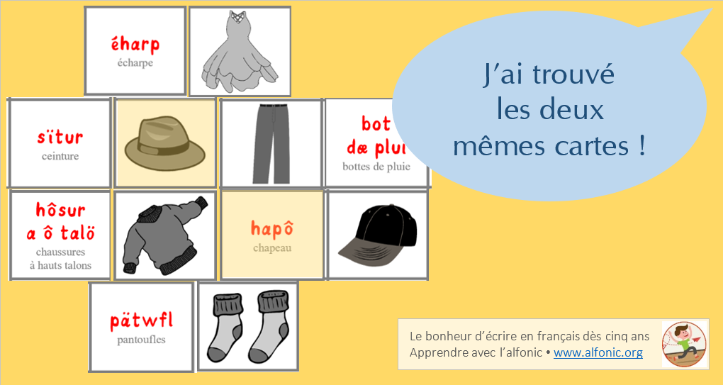 Ordinairement, un jeu de mémory propose aux participants de retourner deux cartes identiques. C’est évidemment une solution pour mémoriser les mots oralement. Nous avons ici privilégié l’option des paires mixtes, c’est-à-dire que les joueurs doivent retrouver les images et les cartes des mots qui leur correspondent. Les mots sont en alfonic, sous-titrés en orthographe. De la sorte, les étudiants doivent non seulement retrouver dans leur mémoire les noms des vêtements en français, mais ils doivent également les lire en alfonic. Et les plus audacieux peuvent bien sûr observer la graphie de ces mots en orthographe.
