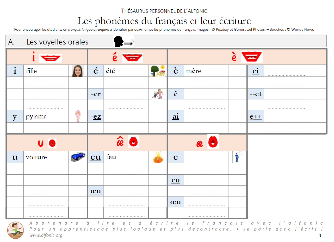 Au début de l’année, nous découvrons en classe de FLE tous les phonèmes du français : voyelles, consonnes et semi-consonnes dans leur graphie alfonic. Chaque lettre alfonic est accompagnée d’une image permettant de mémoriser le mot qui contient le phonème présenté.