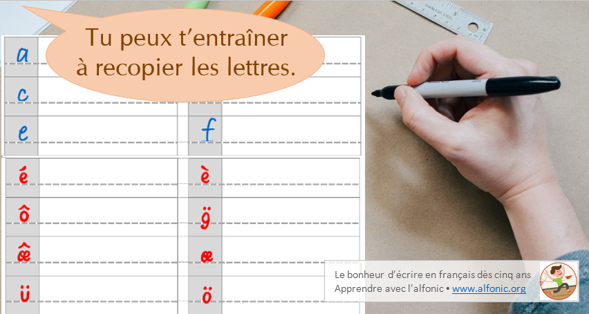 L’alphabet latin n’est pas une évidence pour tous. Par exemple, il n’a rien d’habituel pour les étudiants dont la langue maternelle s’écrit avec l’alphabet arabe, l’alphabet cyrillique ou les caractères chinois. Pour ceux-ci, il sera sans doute utile de proposer quelques exercices d’écriture : d’abord tracer les lettres puis recopier des mots afin d’habituer peu à peu les yeux et le poignet des étudiants à cette nouvelle graphie.