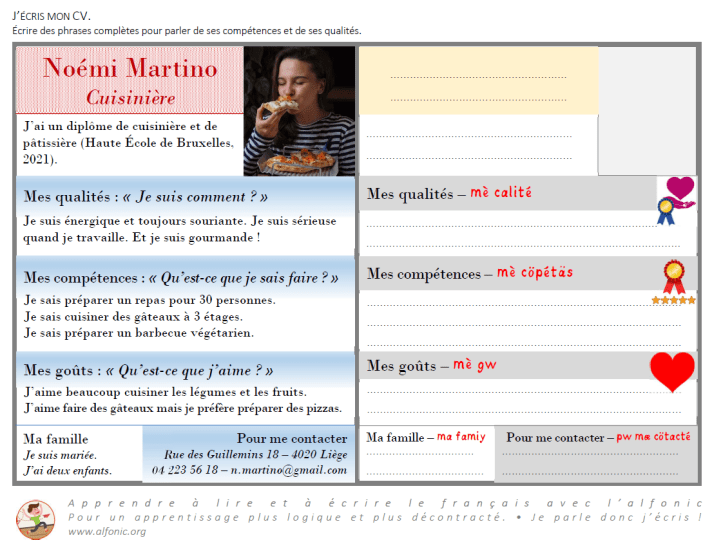 Une fois que le vocabulaire des métiers est bien installé et que les structures de quelques phrases-clés sont mémorisées, permettant d’exprimer concrètement les qualités et les compétences nécessaires à l’exercice d’une activité, on peut proposer aux étudiants d’écrire leur CV : un CV réel, embelli ou totalement fictif.