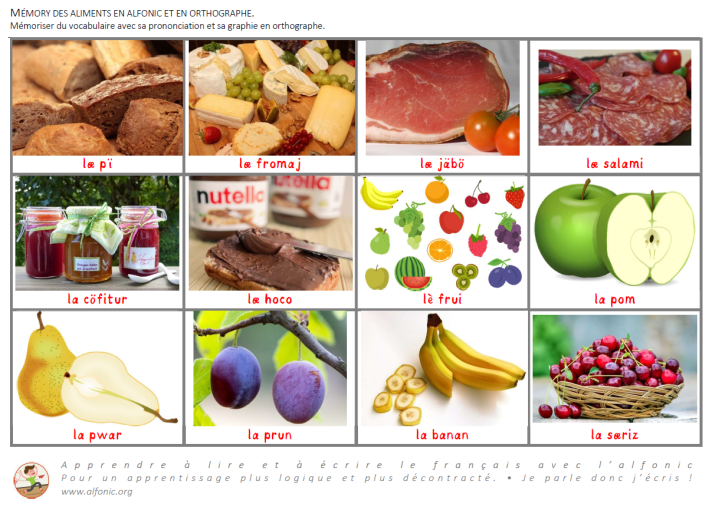 Pour démarrer, on peut simplement jouer au mémory pour découvrir les noms des aliments en français orthographique et leur prononciation en alfonic. Il est toujours utile de faire soigneusement remarquer les ressemblances et les différences entre les deux graphies. C’est également l’occasion de revenir sur les règles plus techniques de la stricte orthographe.