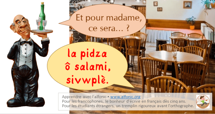 Puis les étudiants pourront composer leur propre menu avec les différents plats et boissons, en alfonic ou en orthographe, si possible en réutilisant le nouveau vocabulaire, mais aussi en utilisant les autres termes qu’ils connaîtraient déjà.